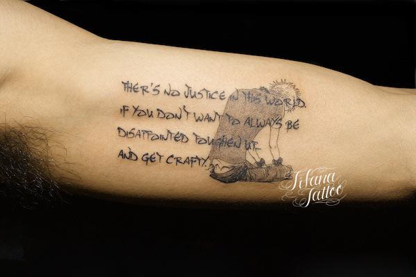 文字|キャラクターのタトゥー タトゥー 一覧 > Tattoo by Mica 2015.03.06 腕の内側の部位に漫画|NANAに登場するキャラクターと文字を組み合わせたデザインを彫ったレタリングのジャンルのタトゥー|刺青作品です。所要時間の目安は1時間半前後です。 Style メンズ レタリング Motif 文字・数字 キャラクター Size iphoneサイズ Body parts 腕