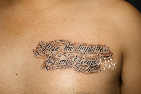 文字にぼかしのタトゥー タトゥー 一覧 > Tattoo by Mica 2015.01.28 筆記体の書体で英文をデザインしたレタリングにぼかしをいれてデザインした文字のタトゥー|刺青作品です。所要時間の目安は1時間半前後、1回で完成するサイズです。 Style メンズ レタリング Motif 文字・数字 Size iphoneサイズ Body parts 胸