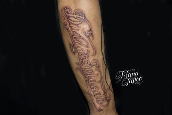 Letter Tattoo タトゥー 一覧 > Tattoo by Mica 2015.01.06 白抜きの文字をデザインしたレタリングタトゥーです。所要時間の目安は3時間前後、1回の施術で完成させる事が可能なサイズです。 Style チカーノ・ブラック&グレイ レタリング Motif 文字・数字 Size CDジャケット Body parts 腕