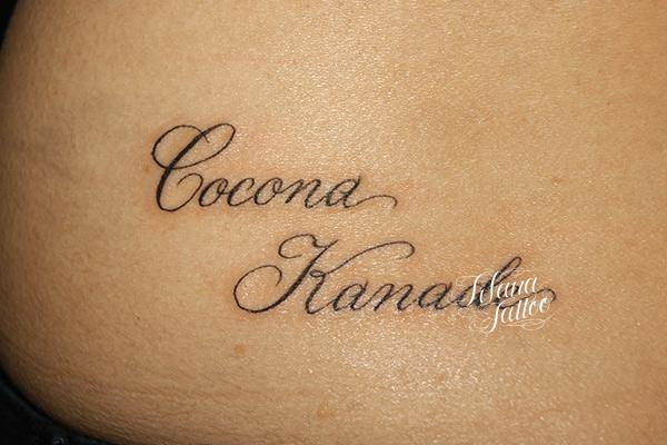 筆記体のレタリングタトゥー タトゥー 一覧 > Tattoo by Mica 2015.01.06 筆記体のレタリングをデザインした文字のタトゥー|刺青作品です。完成までの所要時間は1時間前後です。 Style ガールズ レタリング Motif 文字・数字 Tattoo Tag 筆記体 Size タバコサイズ Body parts 腰