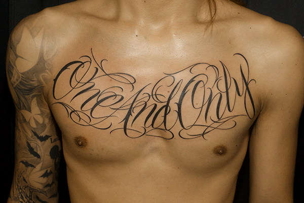 カスタムレタリングタトゥー タトゥー 一覧 > Tattoo by Naoto 2020.01.23 [one and only]の文字|英語|レタリングをカスタムデザインした胸の部位のタトゥー。所要時間の目安は4時間前後です。 Style メンズ レタリング Motif 文字・数字 Size B5サイズ以上 Body parts 胸