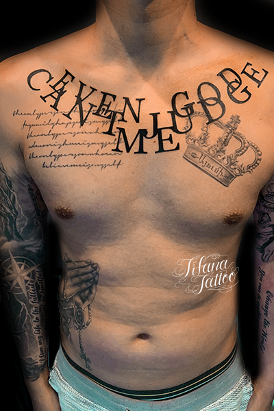 レタリングタトゥー タトゥー 一覧 > Tattoo by Naoto 2020.07.20 既存のタトゥーの上に文字を被せたレタリングタトゥー。被せた文字の所要時間の目安は5時間前後です。 Style メンズ レタリング Motif 文字・数字 Size B5サイズ以上 Body parts 胸