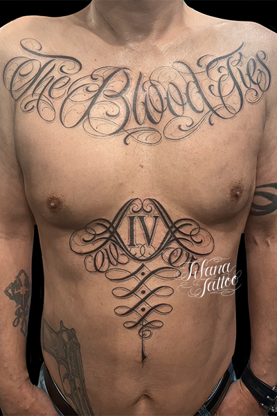 カスタム・レタリングタトゥー タトゥー 一覧 > Tattoo by Yosh 2023.05.03 「The Blood Ties Forever」をカスタムデザインしたチカーノ・レタリング・タトゥー。完成までの来店回数の目安は2回です。