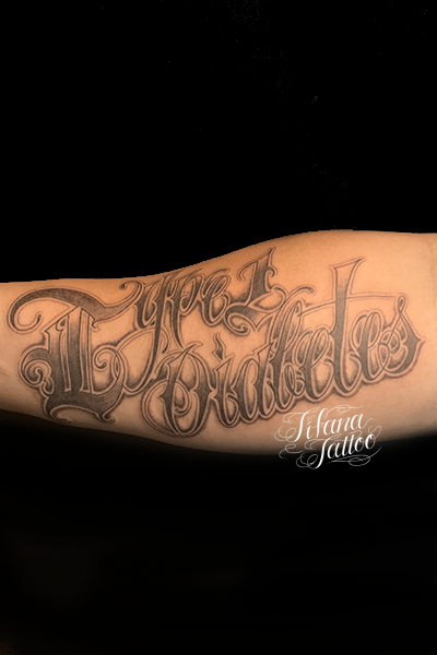 カスタム・レタリングタトゥー タトゥー 一覧 > Tattoo by Mica 2023.12.27 文字をカスタムデザインしたレタリングタトゥー。完成までの所要時間の目安は4時間前後です。 Style メンズ チカーノ・ブラック&グレイ レタリング Motif 文字・数字 Size CDジャケット Body parts 腕
