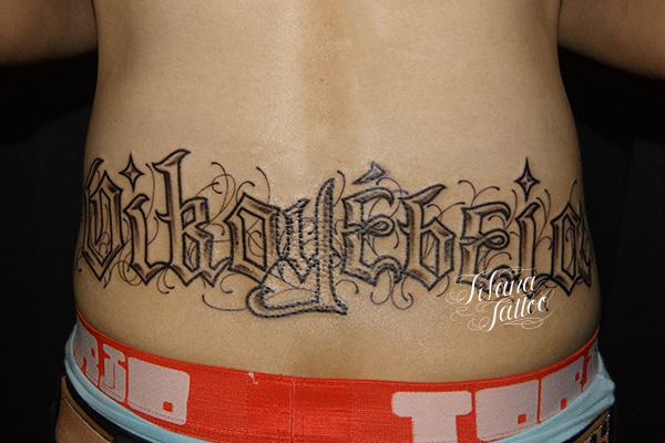 レタリングタトゥー タトゥー 一覧 > Tattoo by Mica 2015.01.01 腰の部位に文字をオリジナルのフォントにデザインしたレタリングタトゥーです。完成までの所要時間の目安は5時間前後です。 Style メンズ レタリング 洋柄 Motif 文字・数字 Size B5サイズ以上 Body parts 腰