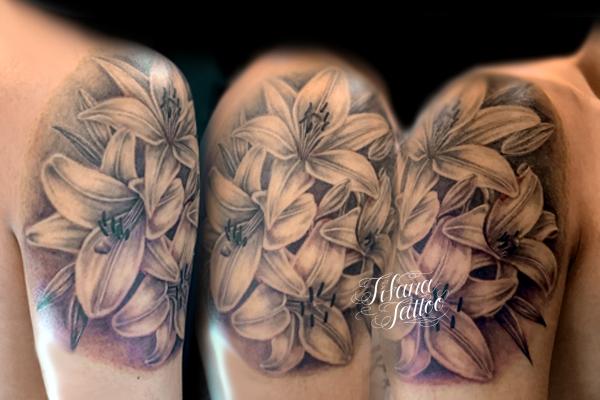 百合のファインライン・タトゥー タトゥー 一覧 > Tattoo by Mica 2020.11.02 百合|ユリのモチーフをデザインしたファインラインタトゥー。所要時間の目安は4時間半前後です。 Style ファインライン メンズ チカーノ・ブラック&グレイ 洋柄 Motif 植物 Tattoo Tag 百合、ユリ Size CDジャケット Body parts 肩