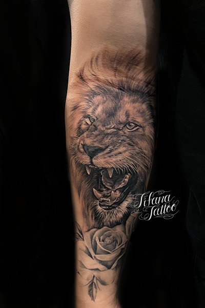 ライオン|薔薇のチカーノ・タトゥー タトゥー 一覧 > Tattoo by Naoto 2023.05.17 ライオン、薔薇をひとつのデザインにまとめたファインライン・タトゥー。完成までの来店回数の目安は4回前後です。 Style メンズ チカーノ・ブラック&グレイ 洋柄 Motif 動物 植物 Size B5サイズ以上 Body parts 腕