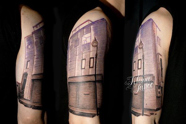 Local Tattoo|製作中 タトゥー 一覧 > Tattoo by Mica 2015.03.30 自分の家をモチーフにした製作中のハーフ・スリーブ・タトゥーです。 Style メンズ Tattoo Tag 風景 Size ハーフスリーブ Body parts 腕