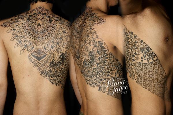 曼荼羅|マンダラのタトゥー タトゥー 一覧 > Tattoo by Mica 2021.12.16 曼荼羅の模様を背中から脇腹にかけてデザインしたタトゥー。所要時間の目安は25時間前後です。 Style メンズ 洋柄 Motif ヘナ・ペイズリー柄 図形 Size B5サイズ以上 背中一面 Body parts 脇 背中