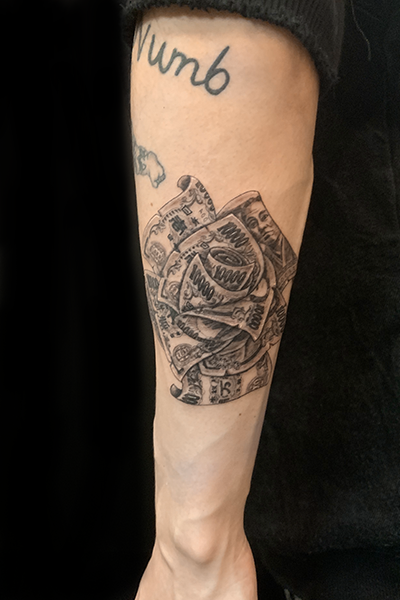 1万円札でマネーローズをデザインしたタトゥー。所要時間の目安は4時間半前後です。