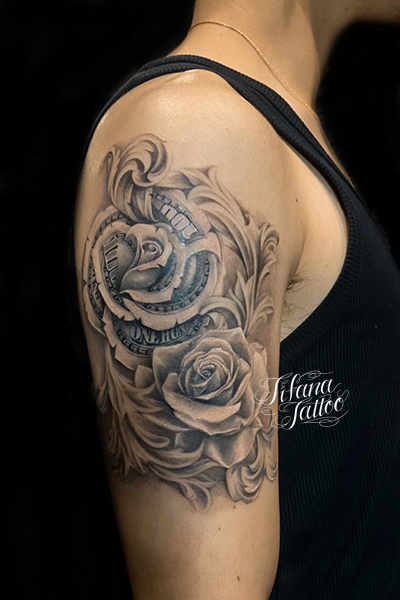 マネーローズ|薔薇のチカーノ・タトゥー タトゥー 一覧 > Tattoo by Naoto 2023.05.09 マネーローズ、薔薇、バロック調のオーナメントをひとつのデザインにまとめたFINE LINE TATTOO。完成までの来店回数の目安は3回前後です。 Style ファインライン メンズ チカーノ・ブラック&グレイ 洋柄 Motif 植物 Tattoo Tag マネーローズ 薔薇、ローズ Size B5サイズ以上 Body parts 腕