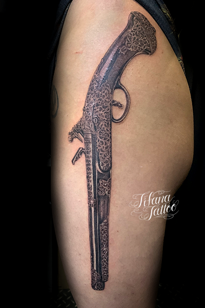 マスケット銃のタトゥー タトゥー 一覧 > Tattoo by Mica 2021.02.06 旧式の銃のモチーフをデザインしたファインラインタトゥー。所要時間の目安は10時間前後です。 Style ファインライン メンズ チカーノ・ブラック&グレイ 洋柄 Motif 武器 Tattoo Tag 銃、ピストル Body parts 腕