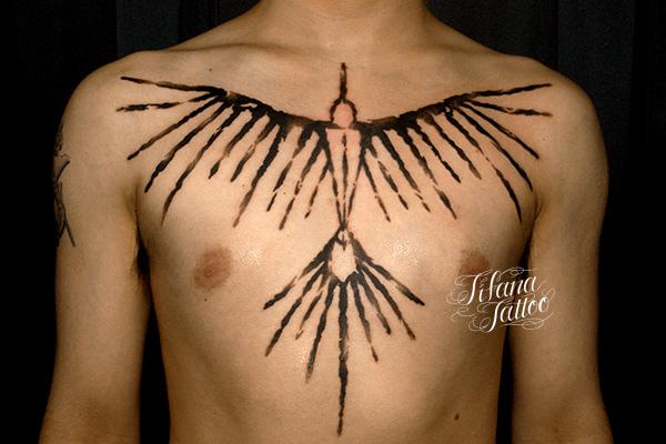 ナスカの地上絵のタトゥー タトゥー 一覧 > Tattoo by Mica 2015.01.22 ナスカの地上絵のモチーフをかすれたイメージでアレンジしたタトゥー|刺青作品です。所要時間の目安は6時間前後、1回から2回で完成するサイズです。 Style メンズ 洋柄 Motif 鳥 シンメトリー Size B5サイズ以上 Body parts 胸