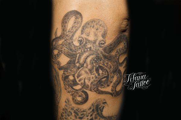 Octopus Tattoo タトゥー 一覧 > Tattoo by Mica 2018.01.10 オクトパス|蛸のモチーフをデザインした腕の部位のタトゥー| 刺青作品です。所要時間の目安は3時間前後、1回で完成するサイズです。 Motif 水の生き物 Size CDジャケット Body parts 腕