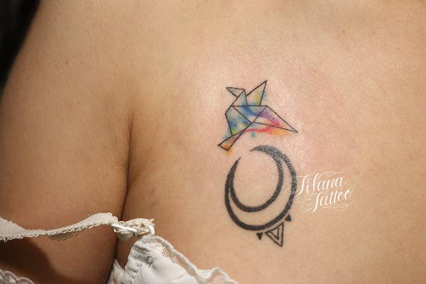 折り鶴|月のタトゥー タトゥー 一覧 > Tattoo by Kaz 2016.02.17 水彩画調の装飾デザインの折り鶴、月、図形をひとつのデザインにまとめた胸の部位のタトゥー|刺青作品です。所要時間の目安は1時間半前後です。 Style ガールズ 洋柄 Motif 鳥 宇宙 Tattoo Tag 月 Size タバコサイズ Body parts 胸