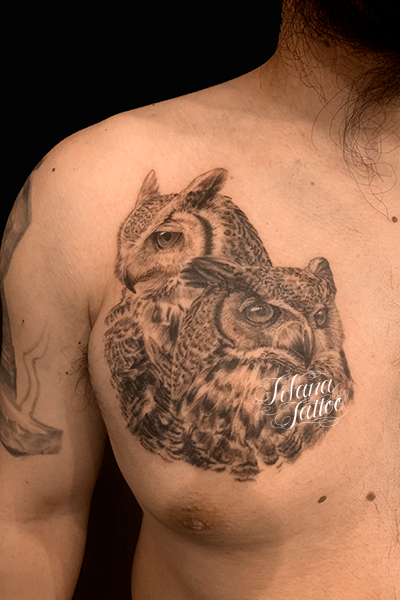 2羽のフクロウのタトゥー タトゥー 一覧 > Tattoo by Mica 2022.07.30 2羽のフクロウ|梟のモチーフを組み合わせてデザインしたタトゥー。所要時間の目安は7時間前後です。 Style メンズ 洋柄 Motif 鳥 Tattoo Tag 梟、フクロウ Size CDジャケット Body parts 胸
