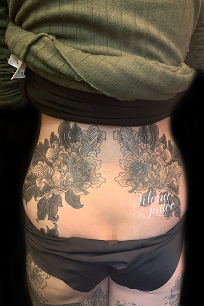 牡丹のタトゥー タトゥー 一覧 > Tattoo by Mica 2023.08.05 牡丹の花をシンメトリーな構図にデザインしたタトゥー。完成までの来店回数の目安は2回です。 Style ガールズ 和柄 Motif 植物 シンメトリー Tattoo Tag 牡丹 Size B5サイズ以上 Body parts 腰