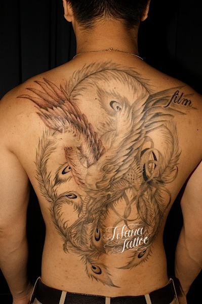 鳳凰の刺青作品|製作中 タトゥー 一覧 > Tattoo by Kaz 2015.12.07 背中一面に鳳凰のモチーフをデザインした製作中のタトゥー|刺青作品です。あと1回で完成です。 Style メンズ Motif 鳳凰 Size 背中一面 Body parts 背中