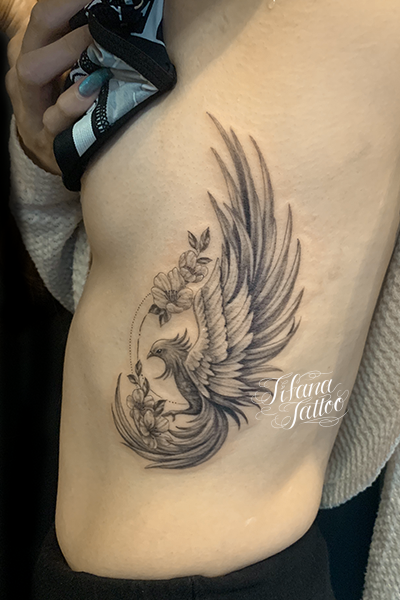 鳳凰|桜のタトゥー タトゥー 一覧 > Tattoo by Mica 2023.08.13 鳳凰と桜のモチーフをひとつのデザインにまとめたタトゥー。所要時間の目安は6時間前後です。 Style ガールズ 和柄 Motif 鳳凰 Size B5サイズ以上 Body parts 脇 腹