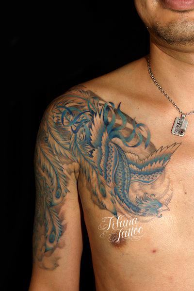 青い鳳凰の刺青作品画像 タトゥー 一覧 > Tattoo by Kaz 2015.01.27 青い鳳凰のモチーフの背景に雲をデザインしたタトゥー|刺青作品です。所要時間の目安は15時間前後、3回から4回で完成するサイズです。 Style メンズ 和柄 Motif 鳳凰 Size ハーフスリーブ Body parts 肩 腕 胸