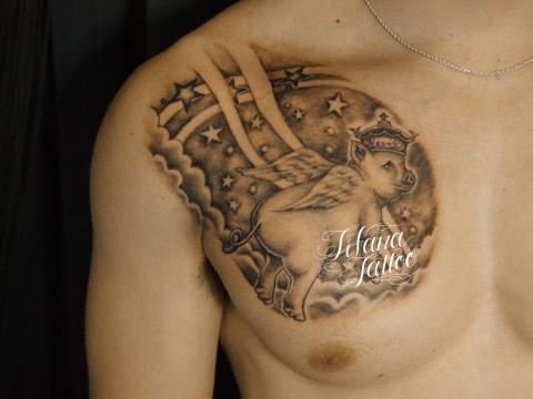 豚のタトゥー タトゥー 一覧 > Tattoo by Kaz 2015.01.13 羽の生えた豚に王冠を被せたモチーフをデザインした動物のジャンルのタトゥー|刺青作品です。所要時間の目安は4時間半前後、1回で完成するサイズです。 Style メンズ チカーノ・ブラック&グレイ 洋柄 Motif 動物 Size CDジャケット Body parts 胸
