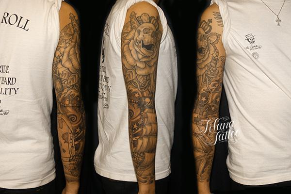 PIRATES TATTOO タトゥー 一覧 > Tattoo by Mica 2015.01.23 スカル、船、財宝などのモチーフで海賊をイメージしてデザインしたフルスリーブ・タトゥーです。所要時間の目安は25時間前後、5回から7回で完成するサイズです。 Style メンズ チカーノ・ブラック&グレイ 洋柄 Motif スカル Size 7分~フルスリーブ Body parts 腕