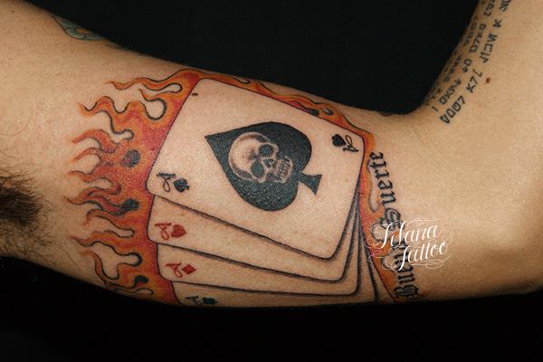 スカルのトランプ・タトゥー タトゥー 一覧 > Tattoo by Mica 2015.01.04 エースのスペードにスカルをデザインしたラッキーアイテムのジャンルのタトゥーです。所要時間の目安は3時間前後、1回の施術で完成するサイズです。 Style メンズ 洋柄 Motif ラッキーアイテム Tattoo Tag スペード トランプ Size CDジャケット Body parts 腕
