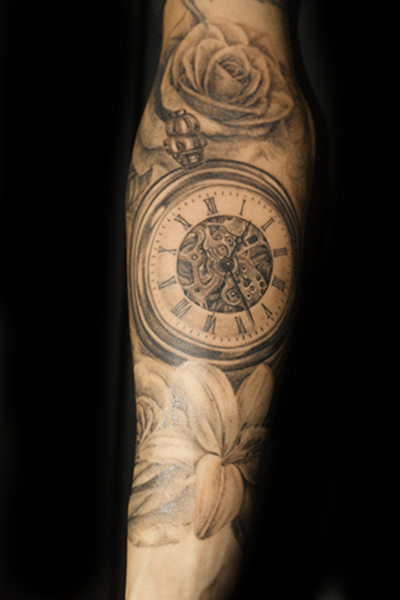 懐中時計|薔薇|百合のタトゥー タトゥー 一覧 > Tattoo by Mica 2020.05.16 懐中時計、薔薇|バラ、百合|ユリの花のモチーフをひとつのデザインにまとめたタトゥー。所要時間の目安は10時間前後です。 Style メンズ チカーノ・ブラック&グレイ 洋柄 Motif アクセサリー 植物 Tattoo Tag 時計 百合、ユリ 薔薇、ローズ Size B5サイズ以上 Body parts 腕
