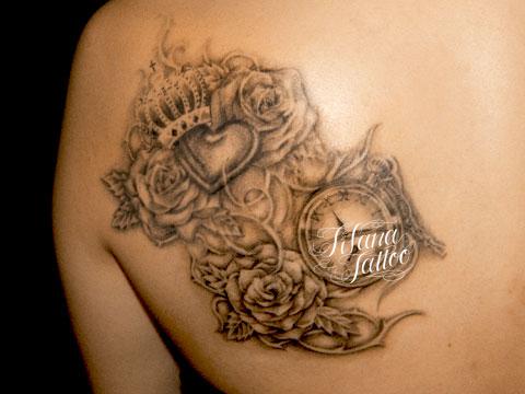 時計|王冠|薔薇|ハートのタトゥー タトゥー 一覧 > Tattoo by Kaz 2015.01.09 4つのモチーフをひとつのデザインにまとめたタトゥー|刺青作品です。所要時間の目安は4時間前後、1回の施術で完成するサイズです。 Style ガールズ 洋柄 Motif ハート アクセサリー 植物 Tattoo Tag 時計 王冠 薔薇、ローズ Size CDジャケット Body parts 肩