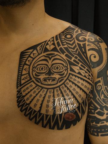 ポリネシアン・トライバルタトゥー タトゥー 一覧 > Tattoo by Mica 2015.01.14 ポリネシアンの民族柄をデザインしたタトゥー|刺青作品です。所要時間の目安は8時間前後、2回で完成するサイズです。 Style メンズ トライバル Size B5サイズ以上 Body parts 胸