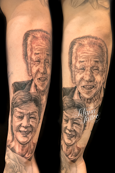 祖父|祖母のポートレート・タトゥー タトゥー 一覧 > Tattoo by Mica 2024.06.25 祖父と祖母の写真をリアルに再現したポートレート・タトゥー。所要時間の目安は10時間前後です。 Style ファインライン メンズ チカーノ・ブラック&グレイ Motif ポートレイト Size B5サイズ以上 Body parts 腕