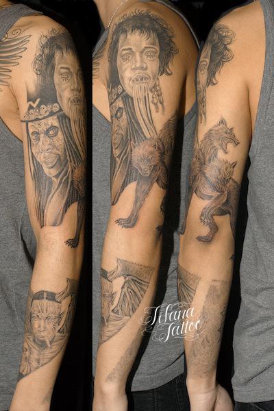 ポートレイトのフルスリーブ・タトゥー|製作中 タトゥー 一覧 > Tattoo by Mica 2015.03.08 ジミ・ヘンドリックスのシュランケンヘッドをデザインしたポートレイト作品にレグバ、ロバート・ジョンソン、ケルベロスのモチーフで制作進行中のフルスリーブ・タトゥー|刺青作品です。 Style メンズ チカーノ・ブラック&グレイ 洋柄 Motif ポートレイト Size 7分~フルスリーブ Body parts 腕