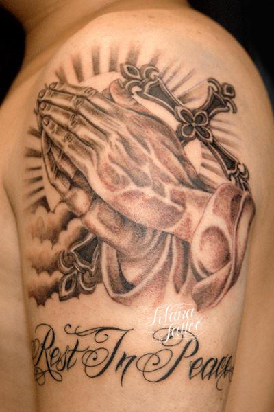 合掌|クロスのタトゥー タトゥー 一覧 > Tattoo by Mica 2015.05.04 合掌|プレイングハンズとクロス、レタリング|メッセージのモチーフをひとつのデザインにまとめたタトゥー|刺青作品です。所要時間の目安は4時間前後、1回で完成するサイズです。 Style メンズ チカーノ・ブラック&グレイ 洋柄 Motif クロス 世界の神様 人体パーツ Tattoo Tag 合掌、祈る手、プレイング・ハンズ Size CDジャケット Body parts 肩