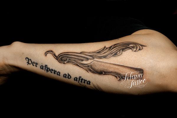RAZOR TATTOO タトゥー 一覧 > Tattoo by Kaz 2015.07.26 RAZOR/レザーのモチーフをデザインしたタトゥー|刺青作品です。 Style メンズ 洋柄 Motif アクセサリー Size iphoneサイズ Body parts 腕