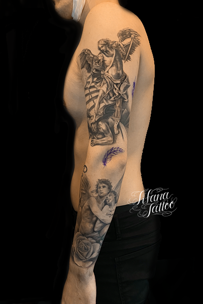 大天使ミカエルのファインライン・タトゥー タトゥー 一覧 > Tattoo by Naoto 2023.05.18 大天使ミカエルを中心に様々な天使を組み合わせたファインライン・タトゥー。 Motif 世界の神様 天使・悪魔 Size B5サイズ以上 Body parts 腕