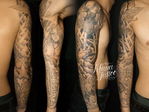 女神|天使|神様のタトゥー タトゥー 一覧 > Tattoo by Kaz 2015.01.08 女神|天使|神様のモチーフをデザインしたフルスリーブタトゥーです。所要時間の目安は28時間前後、7回程度の施術で完成するサイズです。 Style メンズ チカーノ・ブラック&グレイ 洋柄 Motif 世界の神様 女神 天使・悪魔 Size 7分~フルスリーブ Body parts 肩 腕