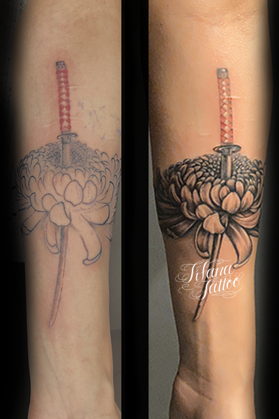 菊のリメイク・タトゥー タトゥー 一覧 > Tattoo by Naoto 2021.08.21 菊の花、日本刀の既存のものをカスタム・リメイクしたタトゥー。所要時間の目安は6時間前後です。 Style メンズ 和柄 Motif 植物 武器 Tattoo Tag 菊 Size CDジャケット Body parts 腕