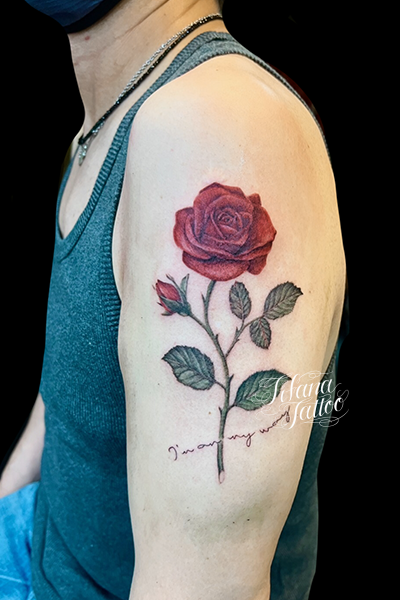 薔薇のファインライン・タトゥー タトゥー 一覧 > Tattoo by Kaz 2022.10.16 薔薇|バラの花、レタリング|文字をひとつのデザインにまとめたファインライン・タトゥー。所要時間の目安は7時間前後です。 Style ファインライン メンズ 洋柄 Motif 植物 Tattoo Tag 薔薇、ローズ Size B5サイズ以上 Body parts 腕