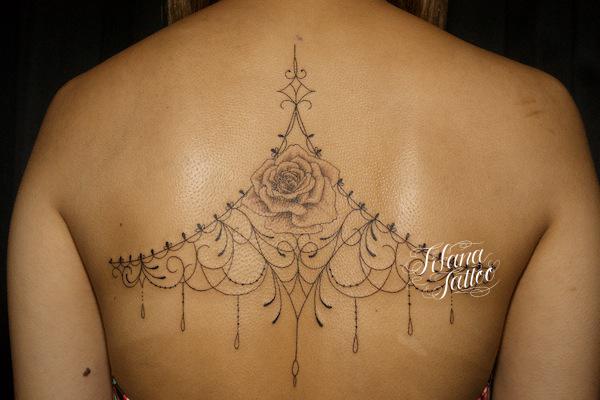 バラとオーナメントタトゥー タトゥー 一覧 > Tattoo by Mica 2019.10.21 薔薇|バラの花、オーナメント柄をひとつのデザインにまとめたシンメトリーなガールズタトゥー。所要時間の目安は4時間前後です。 Style ガールズ 洋柄 Motif 植物 シンメトリー Tattoo Tag 薔薇、ローズ Size B5サイズ以上 Body parts 背中