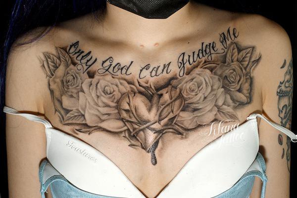 バラ|ハート|文字のタトゥー タトゥー 一覧 > Tattoo by Kaz 2015.06.05 薔薇|バラ、ハート、文字|メッセージのモチーフをシンメトリーなデザインにまとめた胸の部位のガールズタトゥーです。所要時間の目安は20時間前後、5回から6回で完成するサイズです。 Style ガールズ チカーノ・ブラック&グレイ 洋柄 Motif ハート 植物 シンメトリー Tattoo Tag 薔薇、ローズ Size B5サイズ以上 Body parts 胸