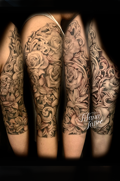 薔薇と百合のファインライン ・タトゥー タトゥー 一覧 > Tattoo by Kaz 2021.01.24 Style ファインライン メンズ チカーノ・ブラック&グレイ 洋柄 Motif 植物 Tattoo Tag 百合、ユリ 薔薇、ローズ Size 7分~フルスリーブ Body parts 腕