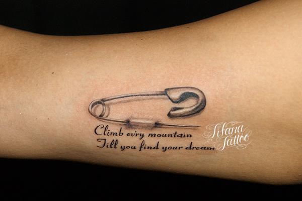 安全ピンと文字のタトゥー タトゥー 一覧 > Tattoo by Kaz 2015.01.11 皮膚に刺さった安全ピンと文字をデザインしたタトゥー|刺青作品です。所要時間の目安は1時間半前後、1回の施術で完成するサイズです。 Style メンズ レタリング 洋柄 Motif 文字・数字 Size タバコサイズ Body parts 腕