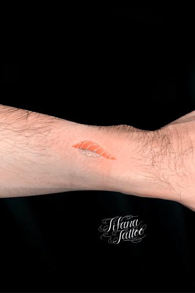 Salmon Sushi Tattoo タトゥー 一覧 > Tattoo by AKI 2020.03.08 サーモン|鮭の寿司のモチーフをデザインしたワンポイントタトゥー。所要時間の目安は1.5時間前後です。 Style メンズ 和柄 Motif 水の生き物 Size ワンポイント Body parts 手