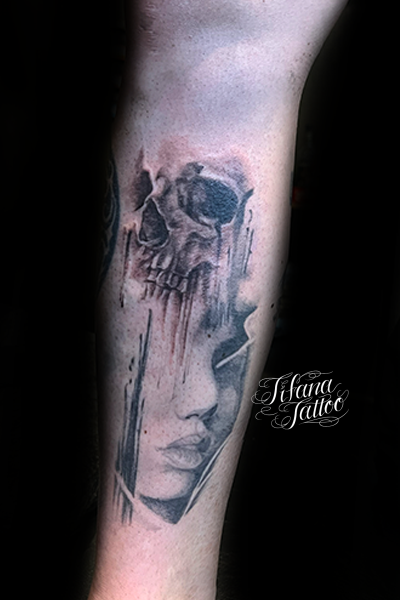 スカル|女性のタトゥー タトゥー 一覧 > Tattoo by Kaz 2023.01.26 スカル、女性の顔をひとつのデザインにまとめたタトゥー。完成までの来店回数の目安は2回です。 Style メンズ チカーノ・ブラック&グレイ 洋柄 Motif スカル Size B5サイズ以上 Body parts 腕