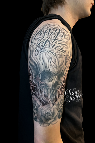 スカル|バラ|文字のタトゥー タトゥー 一覧 > Tattoo by Kaz 2023.12.02 スカル|ドクロ|骸骨、薔薇|バラ、スペイン語|ラテン語のフレーズをひとつのデザインにまとめたチカーノ・タトゥー。完成までの施術回数の目安は4回前後です。 Style メンズ チカーノ・ブラック&グレイ 洋柄 Motif スカル 文字・数字 植物 Size ハーフスリーブ Body parts 腕