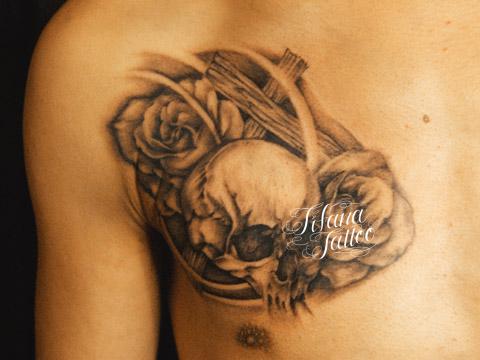 スカル|クロス|薔薇のタトゥー タトゥー 一覧 > Tattoo by Kaz 2015.01.11 スカル|ドクロのモチーフにクロスと薔薇を合わせてデザインしたタトゥー|刺青作品です。所要時間の目安は4時間前後、1回の施術で完成するサイズです。 Style メンズ チカーノ・ブラック&グレイ 洋柄 Motif クロス スカル 植物 Tattoo Tag 薔薇、ローズ Size CDジャケット Body parts 胸