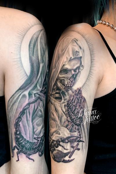 スカルマリア|サソリのタトゥー タトゥー 一覧 > Tattoo by Mica 2020.10.29 スカルマリアのモチーフに蠍|サソリを組み合わせてデザインしたチカーノ・タトゥー。所要時間の目安は14時間前後です。 Style メンズ チカーノ・ブラック&グレイ 洋柄 Motif スカル 世界の神様 昆虫 Tattoo Tag 蠍、サソリ Size ハーフスリーブ Body parts 腕