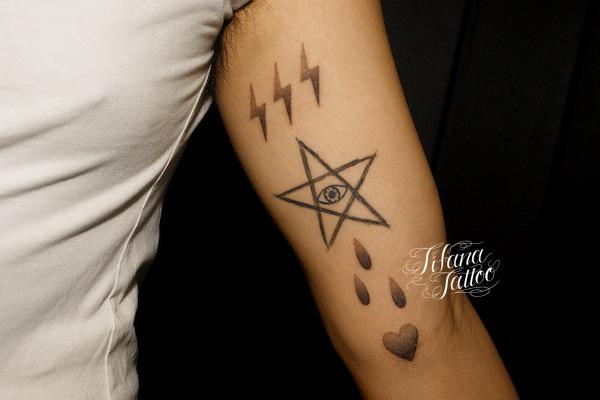 空をイメージしたタトゥー タトゥー 一覧 > Tattoo by AKI 2018.11.03 雷、星、雨、ハート、目のモチーフをひとつのデザインにまとめたタトゥーです。所要時間の目安は1時間半前後です。 Style メンズ 洋柄 Motif ハート 宇宙 Tattoo Tag 星 目 Size iphoneサイズ Body parts 腕