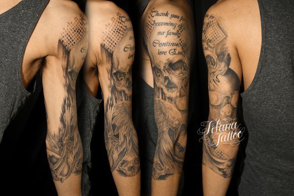 腕七分のスカル・タトゥー タトゥー 一覧 > Tattoo by Kaz 2016.04.15 スカル|ドクロ、カラスがモチーフの背景に蛇の鱗をデザインした腕七分のタトゥー|刺青作品です。所要時間の目安は25時間から30時間前後、5回から7回で完成するサイズです。 Style メンズ チカーノ・ブラック&グレイ 洋柄 Motif スカル 鳥 Size 7分~フルスリーブ Body parts 腕