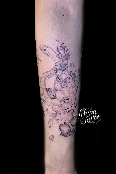 蛇|植物のファインライン・タトゥー タトゥー 一覧 > Tattoo by LEI 2023.02.03 蛇|ヘビ、植物のモチーフをひとつのデザインにまとめたファインライン・タトゥー。所要時間の目安は6時間前後です。 Style ファインライン メンズ 洋柄 Motif 爬虫類 植物 Tattoo Tag 桜、さくら 蛇、ヘビ Size CDジャケット Body parts 腕